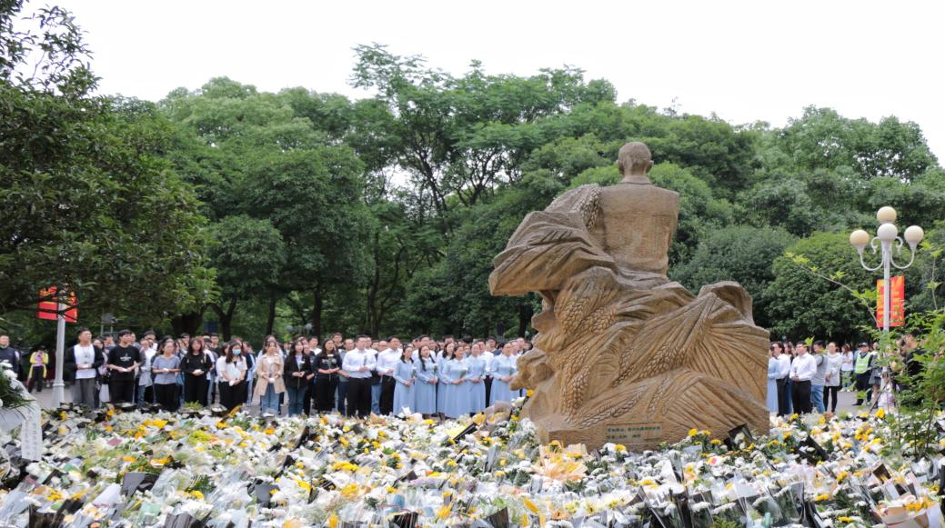 2021年5月,学院师生在袁隆平院士塑像前缅怀袁隆平院士。