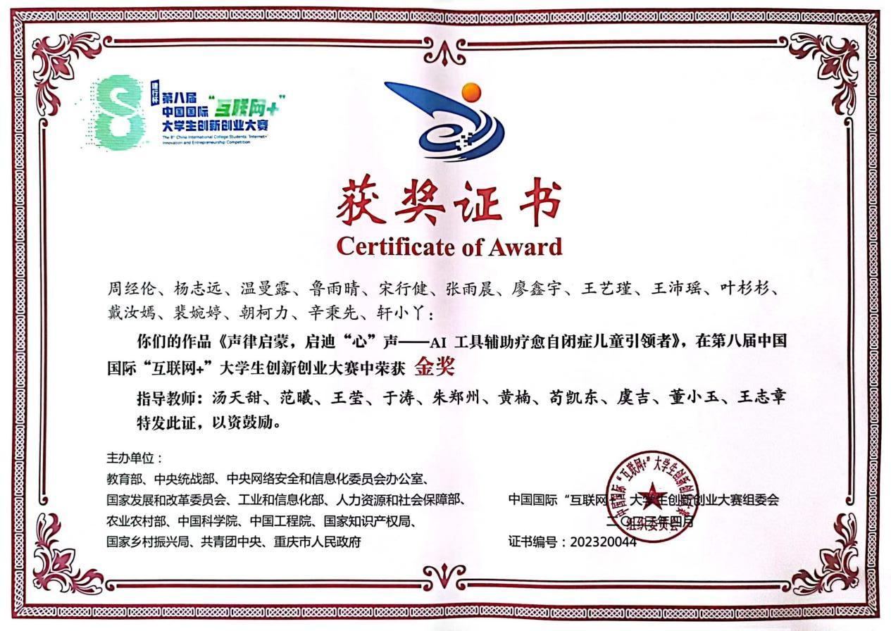 2023年3月,学生作品获第八届中国国际“互联网+”大学生创新创业大赛金奖。