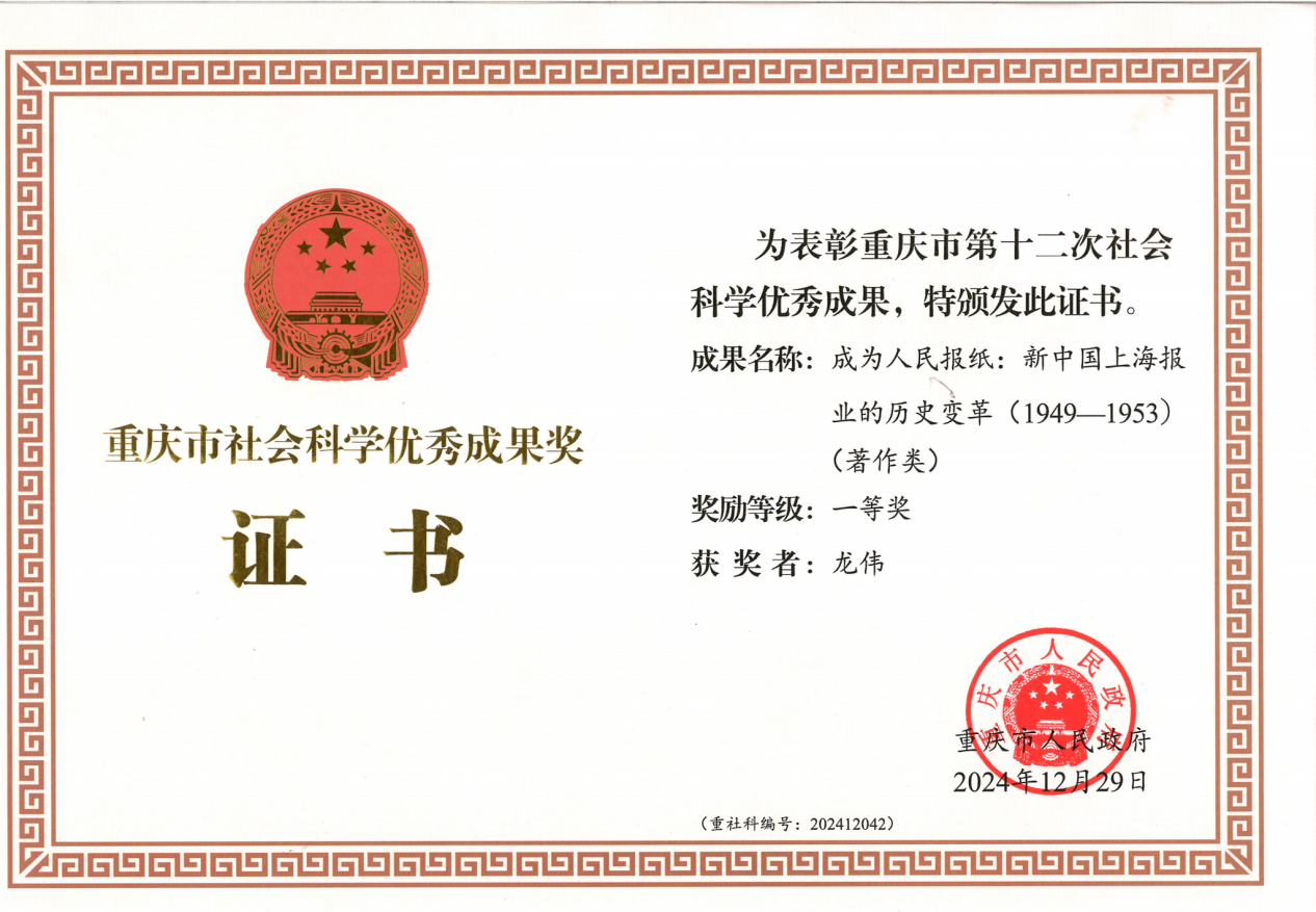 2024年12月,学院研究成果获2024年重庆市社科成果奖一等奖。