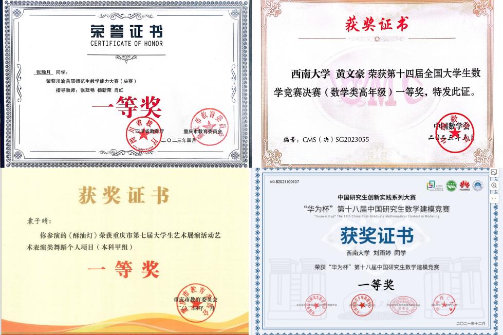 数学学科进入ESI全球排名前1%,数学、统计学获批“十四五”市级重点学科,数学与应用数学、统计学专业获批国家级一流本科专业建设点,数学与应用数学(师范)专业通过第三级认证。获国家级教学成果二等奖1项,获批国家级一流本科课程1门、重庆市一流本科课程3门、重庆市本科高校课程思政示范项目2门。推出重庆市首个数学学科专业图谱课程群及智能教学平台。