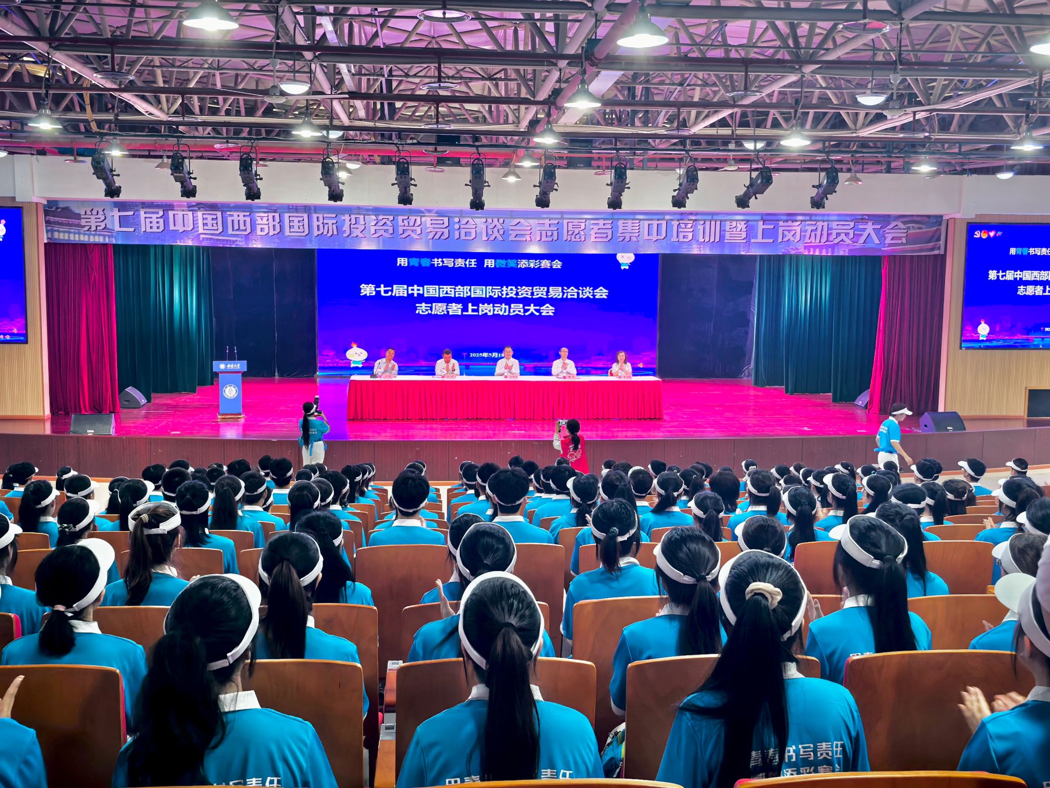 5月18日,第七届中国西部国际投资贸易洽谈会志愿者集中培训暨上岗动员大会在学校举行。市商务委党组成员、副主任、中新示范项目管理局副局长孙熙勇,团市委副书记张珂,学校党委副书记黄杰出席活动,市商务委会展处、市志愿服务工作指导中心、学校团委相关负责人,高校带队教师以及全体志愿者500余人参加。