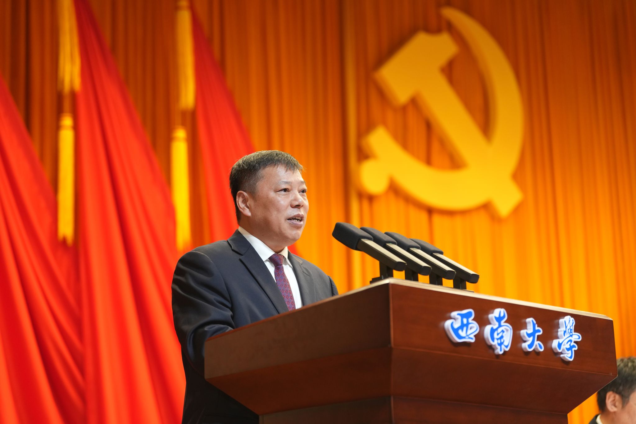 大会的主题是:以习近平新时代中国特色社会主义思想为指导,深学笃用习近平总书记关于教育的重要论述,坚持和加强党的全面领导,落实立德树人根本任务,统筹推进教育科技人才一体发展,团结带领全体党员同志和全校师生员工,胸怀大局、矢志一流,改革创新、以质图强,奋力谱写建设特色鲜明的世界一流大学崭新篇章,为教育强国建设贡献西大力量!