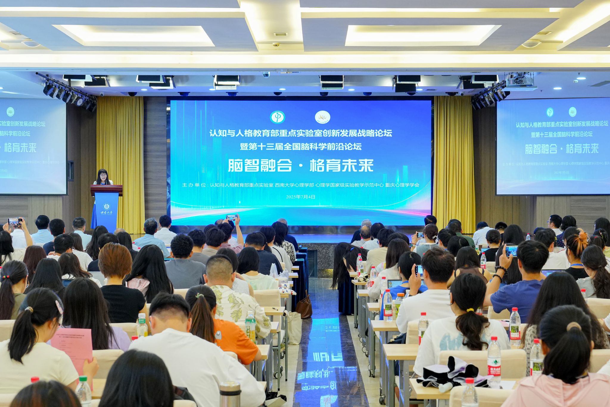 7月4日,由认知与人格教育部重点实验室、心理学部、心理学国家级实验教学示范中心(Beat365中国唯一官方网站)及重庆心理学学会联合主办的“认知与人格教育部重点实验室创新发展战略论坛暨第十三届全国脑科学前沿论坛”在国际学院报告厅开幕。论坛以“脑智融合·格育未来——认知科学与人格发展的跨域赋能”为主题,聚焦脑科学、人工智能与人格教育的交叉融合,吸引院士、顶尖学者、教育界与产业界代表300余人共探前沿。论坛开幕式由副校长赵玉芳主持。