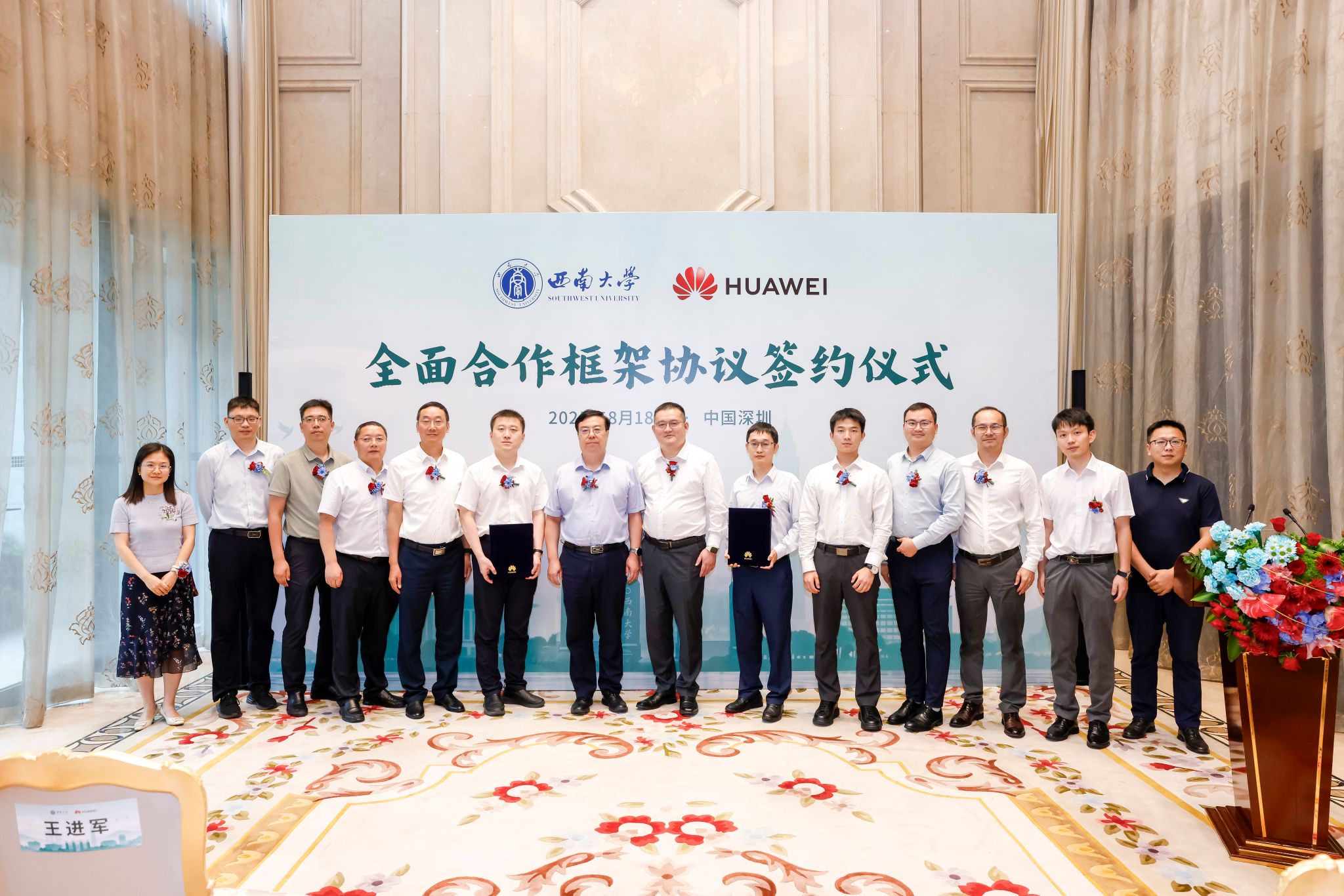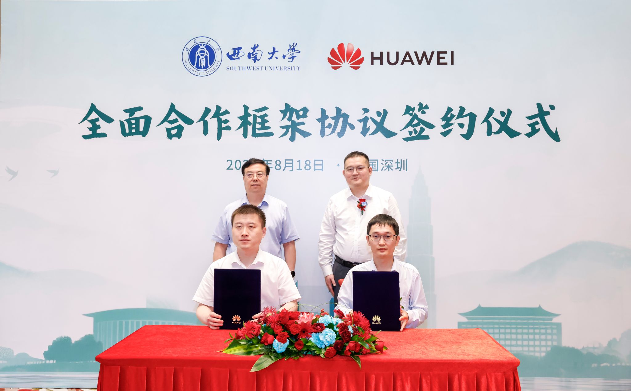 8月18日,学校与华为技术有限公司在深圳签署全面合作框架协议。校长王进军、副校长范大明,华为公共事业军团教育医疗副总裁、全球教育医疗行业总经理赵祎鑫等双方代表出席仪式;党政办公室、本科生院、社会服务处、信息化建设办公室、计算机与信息科学学院 软件学院负责人作为代表团成员参加。