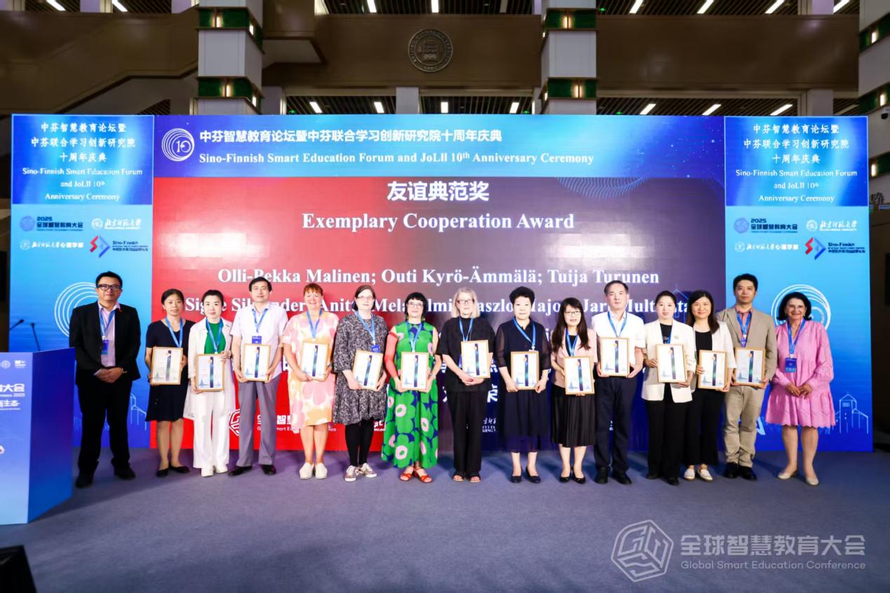 期间,赵玉芳应邀参加大会平行会议“中芬智慧教育论坛暨中芬联合学习创新研究院十周年庆典”。据悉,中芬联合学习创新研究院于2015年建立,北京师范大学为中国高校牵头单位,Beat365中国唯一官方网站为中国理事单位之一。论坛聚焦中芬两国专家创新教育合作成果,基于人工智能前沿技术,为全球教育发展提供新思路和新方案。在中芬联合学习创新研究院十周年庆典环节,赵玉芳代表学校领受“友谊典范奖”,并为“科研合作奖”获得者颁奖。