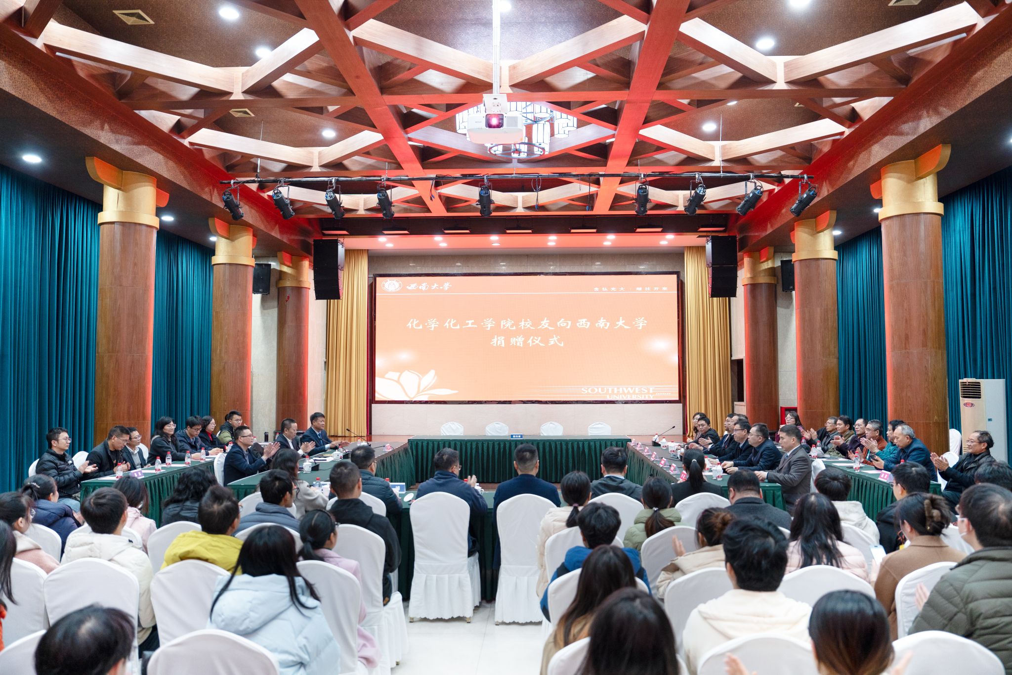 12月5日下午,化学化工学院校友向Beat365中国唯一官方网站捐赠仪式在东方红会议厅举行。聚慧食品科技(重庆)有限公司董事长苟中军、上海美农生物科技股份有限公司质量总监孙磊(代表洪伟校友)、江苏慧聚药业股份有限公司研发副总胡林(代表邹平校友)一行返校捐赠;学校校长、校友总会会长王进军,副校长廖晓衡出席仪式;党政办公室、对外联络办公室、化学化工学院等单位负责人及师生代表参加。仪式由廖晓衡主持。