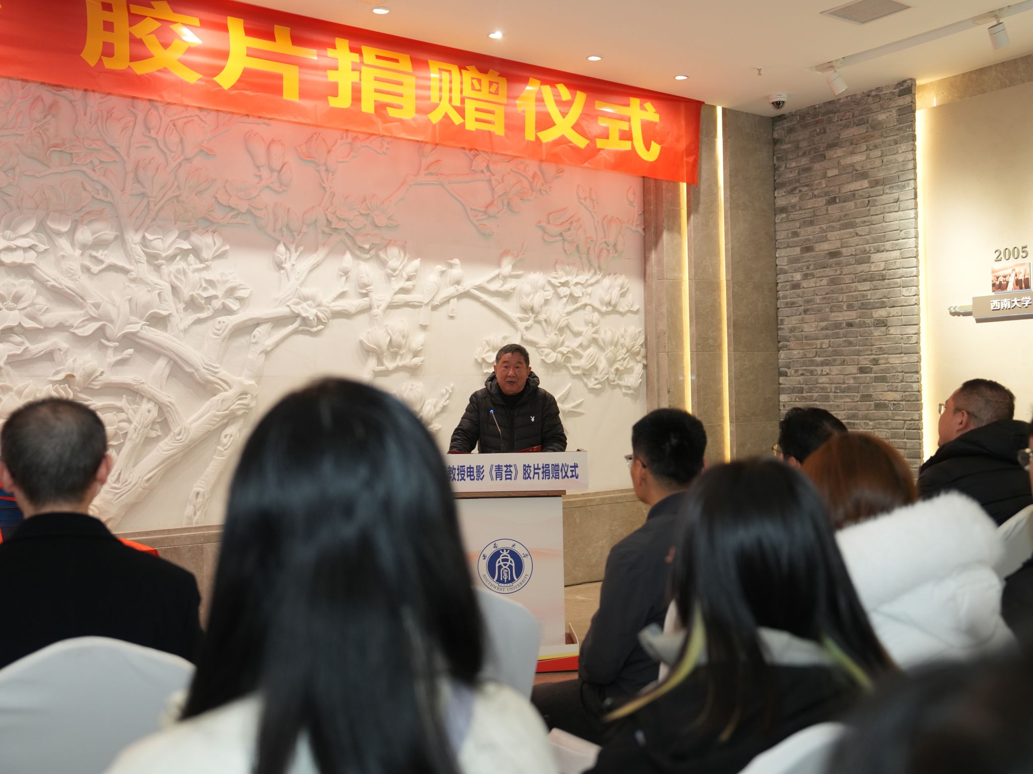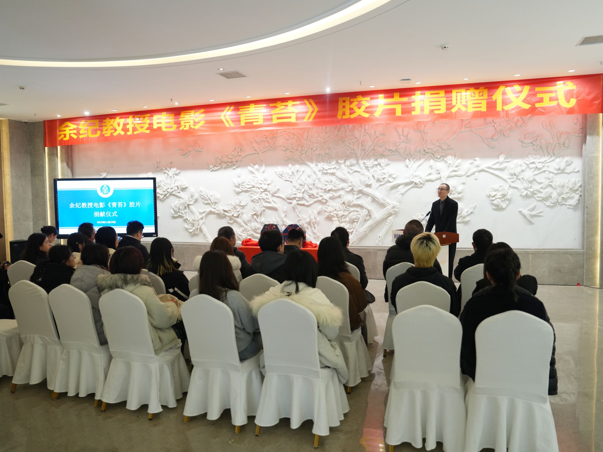12月10日下午,校史馆一楼序厅内,暖意融融,学校举办著名导演、编剧,文学院余纪教授电影《青苔》胶片捐赠仪式。校党委副书记黄杰,党委常委、党委宣传部、党委网络工作部部长孙楚航出席仪式。党委宣传部,档案馆、校史馆、博物馆,文学院,马克思主义学院有关负责人、师生代表参加。仪式由档案馆、校史馆、博物馆副馆长郑劲松主持。