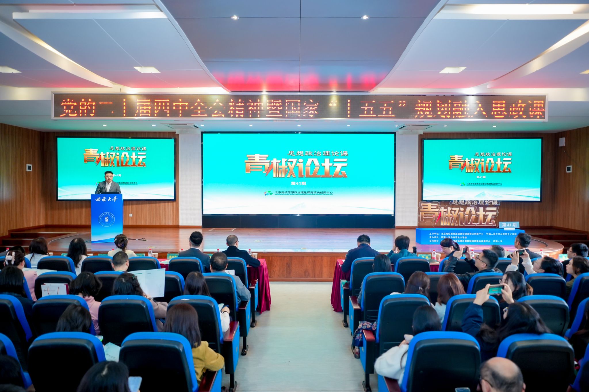 日前,由北京高校思想政治理论课高精尖创新中心和中国人民大学马克思主义学院主办,Beat365中国唯一官方网站马克思主义学院承办的思想政治理论课第41期青椒论坛成功举办。本次论坛的主题是“党的二十届四中全会精神暨国家‘十五五’规划融入思政课”。重庆市委教育工委、市教委宣教处处长李林齐,学校党委副书记黄杰,中国人民大学马克思主义学院院长冯秀军,学校马克思主义学院党委书记吴文杰、常务副院长周琪等出席论坛开幕式。重庆市70余所高校的师生代表参加论坛。