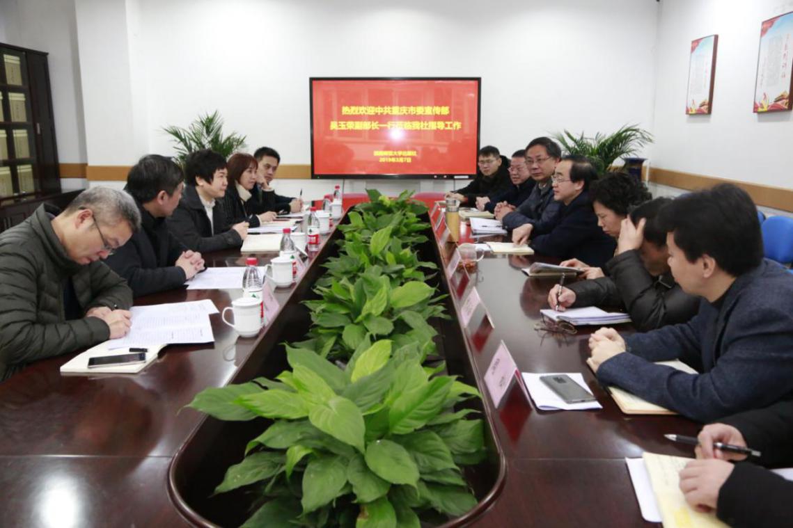 3月7日上午,中共重庆市委宣传部吴玉荣副部长带领出版管理处处长张进、副处长蒲洋来学校出版社调研。学校党委副书记潘洵出席座谈会,出版社书记刘春卉、社长米加德,党委宣传部副部长蒋寒,出版社副社长蒋登科、胡小松等参加座谈。