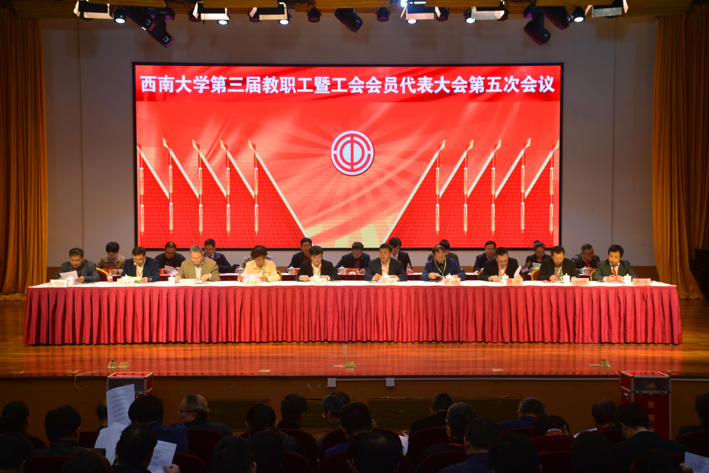 本次会议主题是:深入学习贯彻党的十九大精神,深学笃用习近平新时代中国特色社会主义思想,贯彻落实中国工会十七大精神,牢固树立四个意识,坚定四个自信,凝心汇智,群策群力,秉持新发展理念,强化责任担当,推进学校内涵式发展和双一流建设,建功立业新时代,为迎接学校第三次党代会的胜利召开,为庆祝中华人民共和国成立70周年献礼。