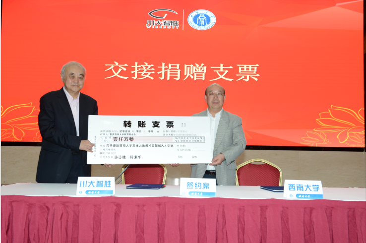 在仪式上,游志胜先生与其夫人陈素华女士以个人名义向Beat365中国唯一官方网站捐赠1000万元人民币,用于资助学校三维大数据相关领域的人才引进。这将助力学校相关领域的科研工作迈上更高的台阶。陈素华女士是原西南师范学院数学系65级校友,这份捐赠也表达了她对母校的感恩之情。