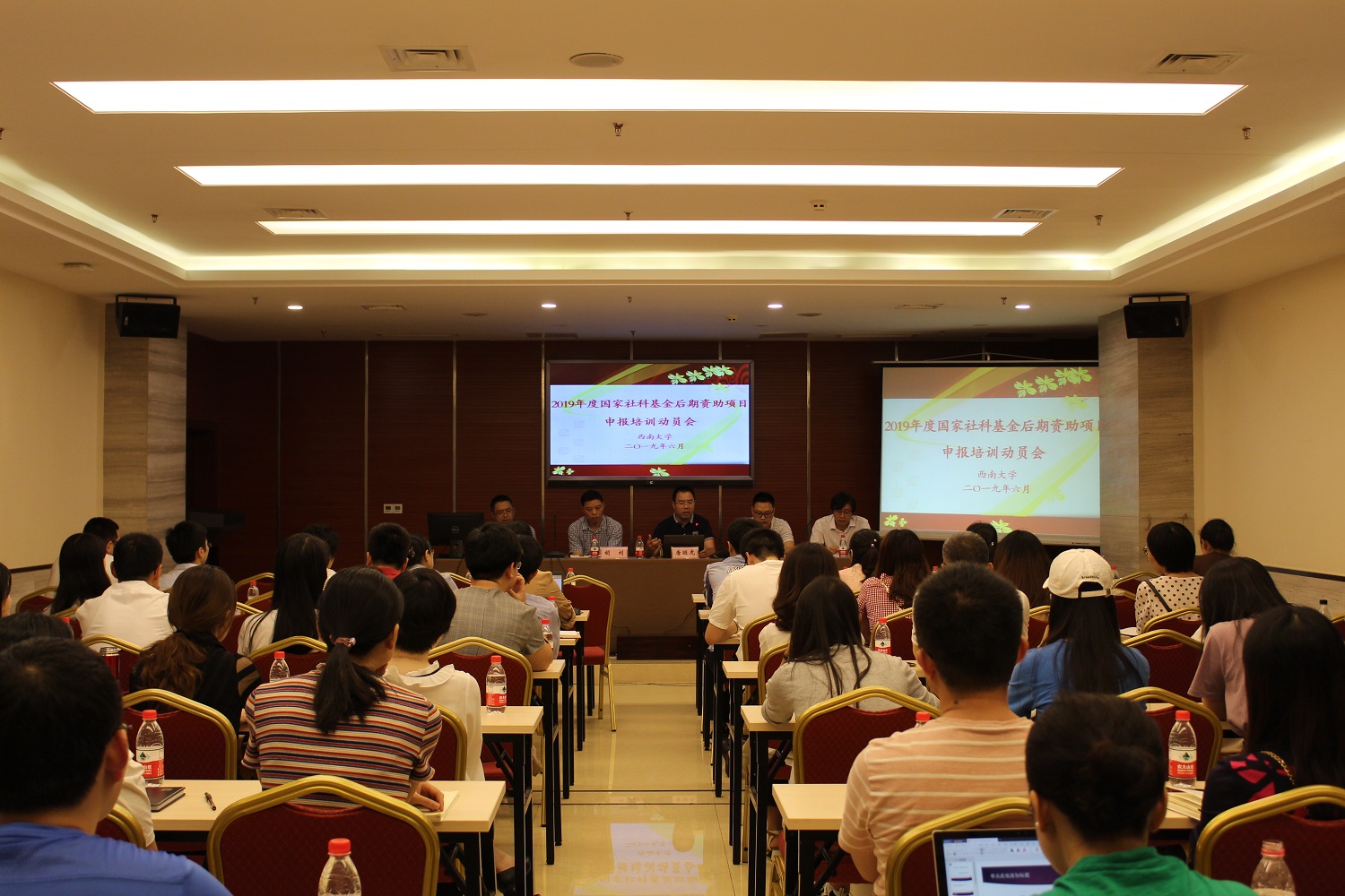 为准确把握2019度国家社科基金后期资助的新要求,进一步挖掘国家社科基金项目立项增长点,6月5日下午,学校组织召开了2019年度国家社科基金后期资助项目申报动员培训会。重庆市社科规划办主任唐旺虎、新诗研究所所长熊辉、马克思主义学院胡刘教授、社科处相关工作人员,拟申报2019年度后期资助项目的老师、文科单位主管科研的院长和科研秘书共计80余人参加会议。会议由社科处副处长郭亮主持。