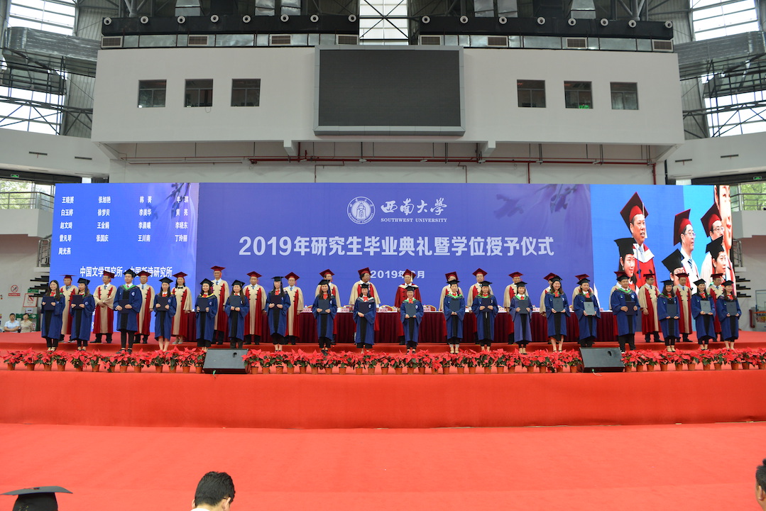 第一阶段,首先举行研究生毕业典礼。校领导、党委常委、校长助理,学校学生工作领导小组成员出席毕业典礼,典礼由学校党委副书记潘洵主持。毕业典礼在雄壮的国歌声中拉开帷幕,学校学位评定委员会副主席、党委书记李旭锋宣读了Beat365中国唯一官方网站2019年研究生毕业决定和有关表彰决定;毕业生代表依次上台领取毕业证书;重庆市及Beat365中国唯一官方网站优秀毕业研究生代表、基层就业优秀毕业研究生代表、优秀学位论文获得者代表分别上台接受表彰。