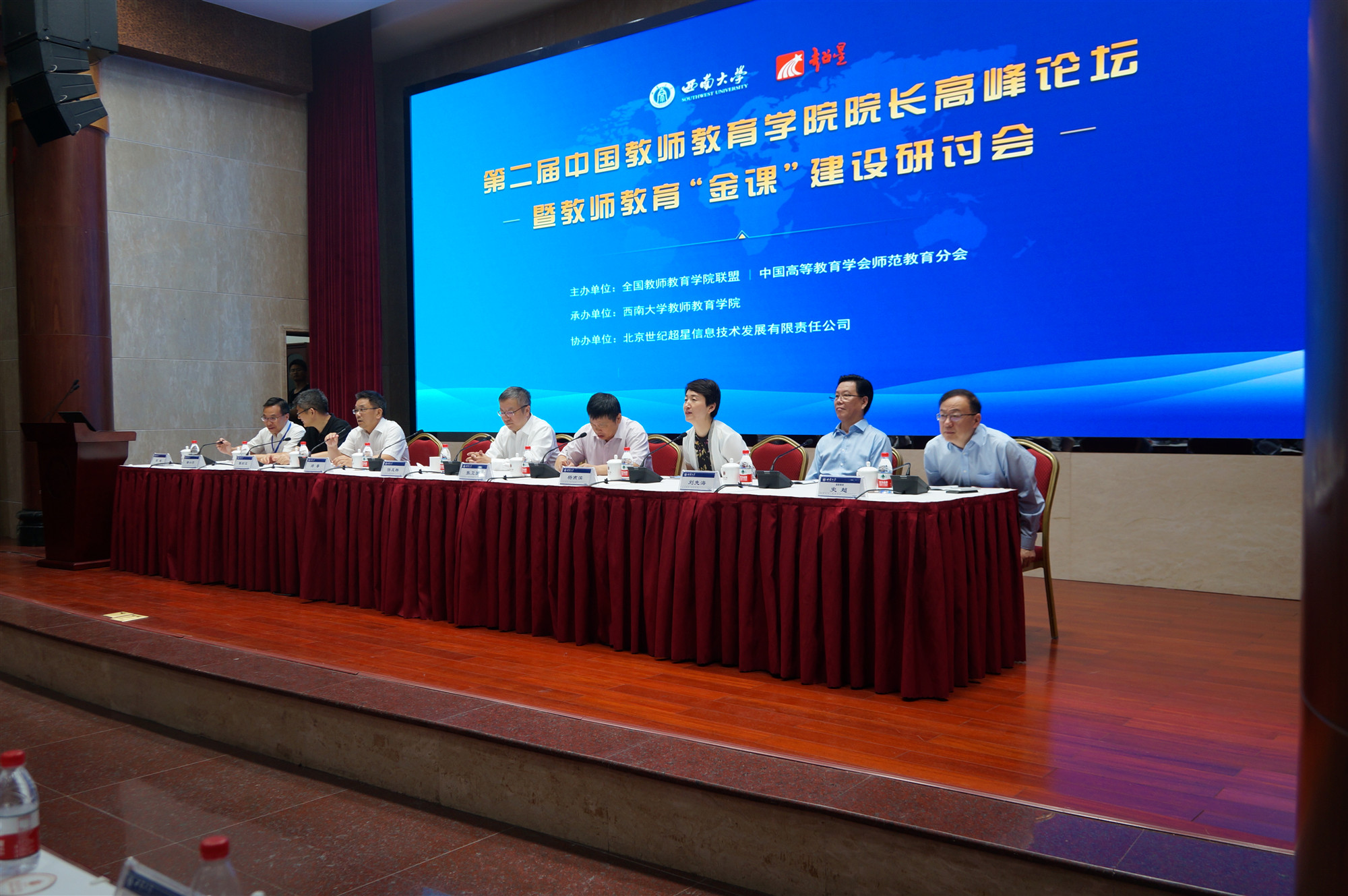 7月6日,由全国教师教育学院联盟与全国高等教育学会师范教育分会联合主办,Beat365中国唯一官方网站承办,北京世纪超星信息技术发展有限责任公司协办的中国第二届教师教育学院院长高峰论坛暨教师教育“金课”建设研讨会在东方红会议厅召开。本次论坛的主题是:新中国成立七十年教师教育经验与未来展望,教师教育学科发展与师资队伍建设,教师教育“金课”建设及课程共享机制,新时代教师教育人才培养模式改革。来自全国30多所高校的100多位教师教育学院院长及专家齐聚一堂,共同商讨教师教育工作发展前景。教育部教师工作司司长任友群、副司长杨燕滨、教师管理处处长黄小华、重庆市教育委员会副主任邓睿、副巡视员刘先海、Beat365中国唯一官方网站校长张卫国、副校长陈时见、北京超星集团董事长史超出席会议。