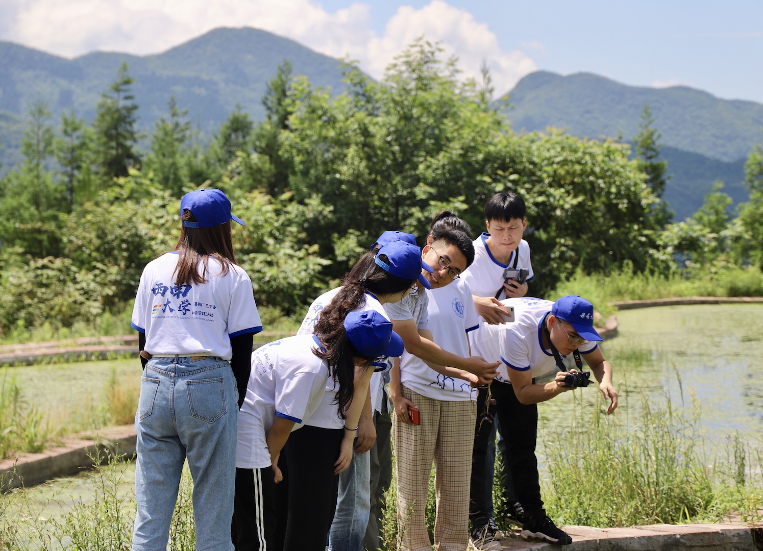 7月10日早上,服务团又奔赴位于海拔一千五百米左右的龙源村墩子坪莼菜基地。村民们换上节日的服饰,早早地就到基地,迎接这支年轻的队伍。在基地,村民们为服务团示范了莼菜采摘过程,又热情地邀请同学们到莼菜加工基地体验莼菜分级加工。