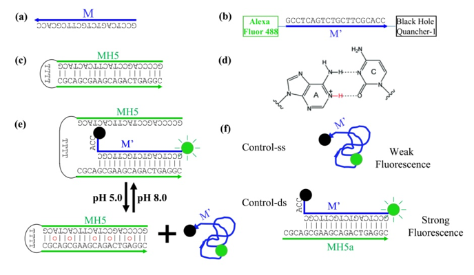 pH响应性DNA分子机器的设计为许多重要的研究奠定了基础。它们主要基于DNA triplex和i-motif,严格的序列要求(链需要富含嘌呤、嘧啶或胞嘧啶)极大地限制了pH响应性DNA的应用。若能为一般核酸序列合理地设计pH响应性的DNA分子机器,将极大地增强为上述应用而控制DNA结构的能力,并有助于进一步了解生命分子DNA的物理化学性质。团队为此设计了酸碱度响应的寡核苷酸类药物载药体系,并由此发现了利用A-C错配设计非序列依赖的酸碱度响应性分子机器的一般规则,这种设计方法不仅在其他寡核苷酸类药物和随机序列上得到验证,同时也通过杂交链式反应(HCR)进一步证实。在该研究中,利用聚丙烯酰胺凝胶电泳和荧光共振能量转移技术(FRET)对其动力学过程进行了分析。A-C错配的设计不局限于任何特定的序列,可以十分便捷地用于pH响应的分子机器的设计。与指数富集的配体系统进化技术(SELEX)在体外筛选pH响应性序列方面相比,展现出省时、省力和效率高的优势。