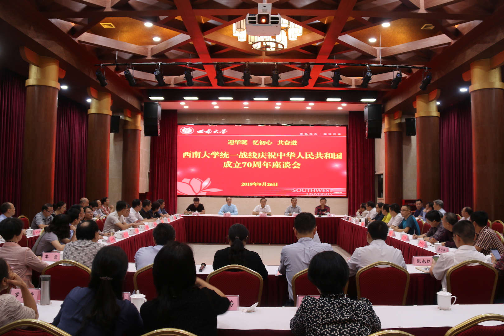 9月26日下午,学校统一战线庆祝新中国成立70周年座谈会在东方红会议厅举行。本次座谈会以“迎华诞 忆初心 共奋进”为主题,学校党委副书记、党委统战部部长安春元出席并主持会议,相关职能部门负责人参加会议。