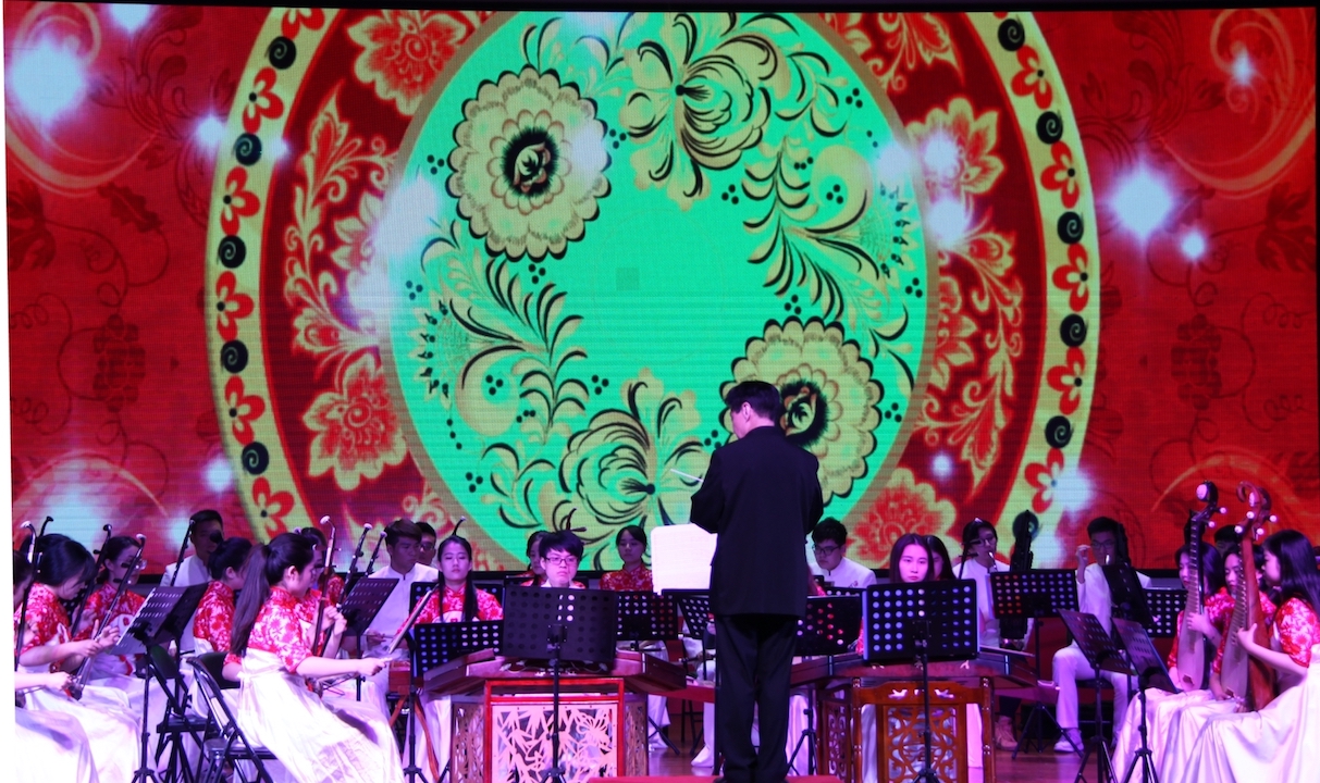 音乐会在音乐学院民乐团恢宏的演奏下拉开序幕,民乐合奏《我的祖国》《弓舞》(小刀会组曲)彰显了民乐的大气悠扬,正应祖国发展的繁荣景象。