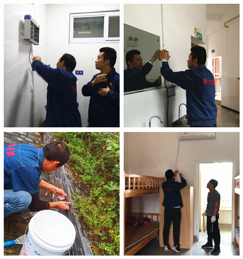 联系第三党支部的后勤集团班子成员、集团纪委委员等也参与了活动。支部17名党员身穿整齐的蓝色工装,自备工具,按业务岗位分成水、电、小修三个班组,分头排查水电线路故障、维修管线、修补墙面和瓷砖等。经过一天的忙碌,食堂的抽油烟机和开关面板通电了,教室的直饮水机也不再跳闸,草丛的喷灌系统水压稳定了,寝室破损墙面也恢复了平整。