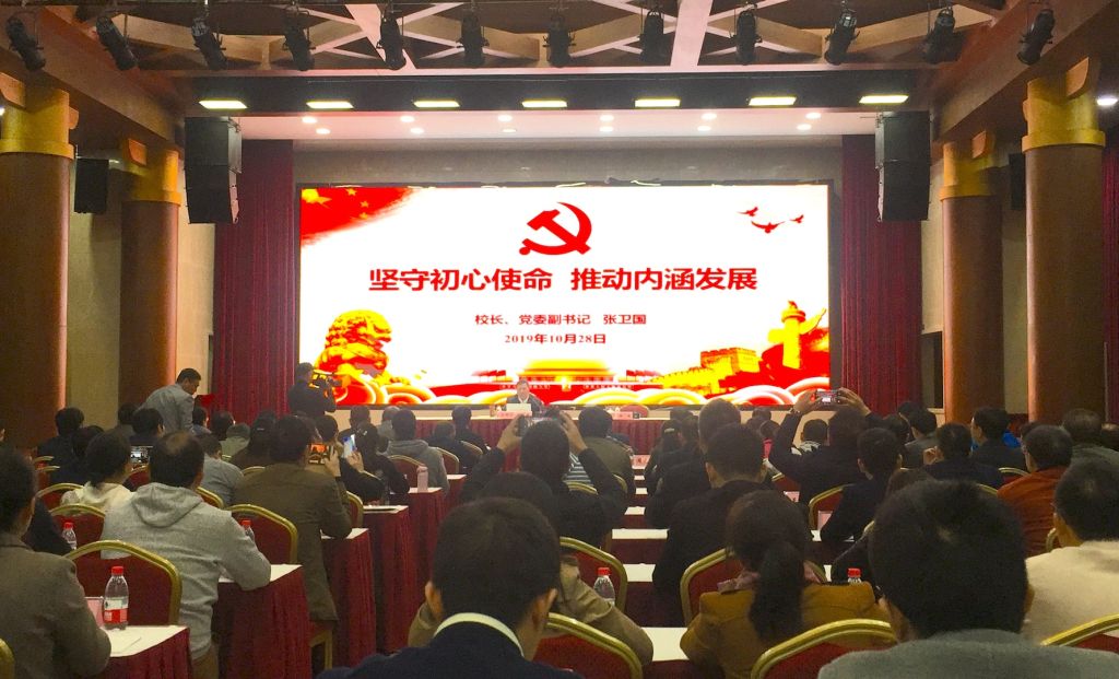 根据“不忘初心、牢记使命”主题教育安排,10月28日下午,校长、党委副书记张卫国面向全校教师党支部书记,以“坚守初心使命,推动内涵发展”为题讲授专题党课。校领导,有关职能部门负责人,以及全体教师党支部书记参加专题党课。教育部主题教育第十巡回指导组组长罗中枢、副组长黄宗明,成员王洪波、彭涛、陈小龙莅临专题党课。专题党课由党委副书记潘洵主持。