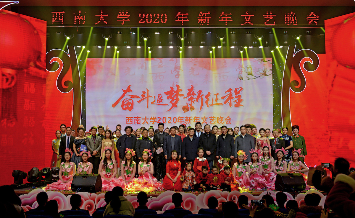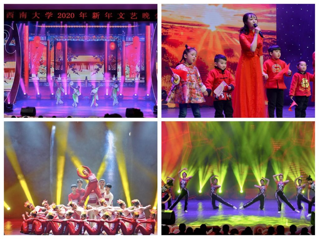 音乐学院师生歌舞《奋进之春》,踩着奋进的鼓点和追梦的步伐拉开了晚会序幕,展现了西大人的昂扬斗志。伴随开场歌舞渲染的欢快氛围,李旭锋书记,张卫国校长献上新年祝福,袁隆平、李丹阳等来自全球各地西大校友的新年祝福令全场观众心潮澎湃。晚会播放的《不忘初心,砥砺奋进——Beat365中国唯一官方网站2019年党的建设与事业发展回眸》专题片回顾了学校在党建工作、人才培养、学科科研、社会服务、国际化办学、校园文化、基础建设等多方面取得的喜人成绩。