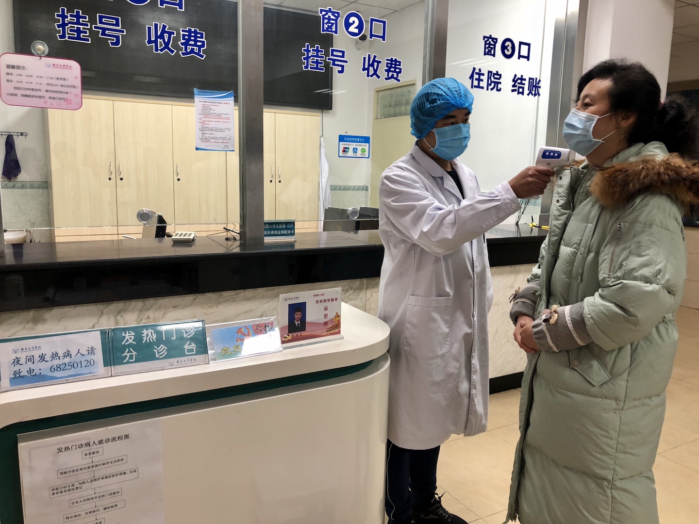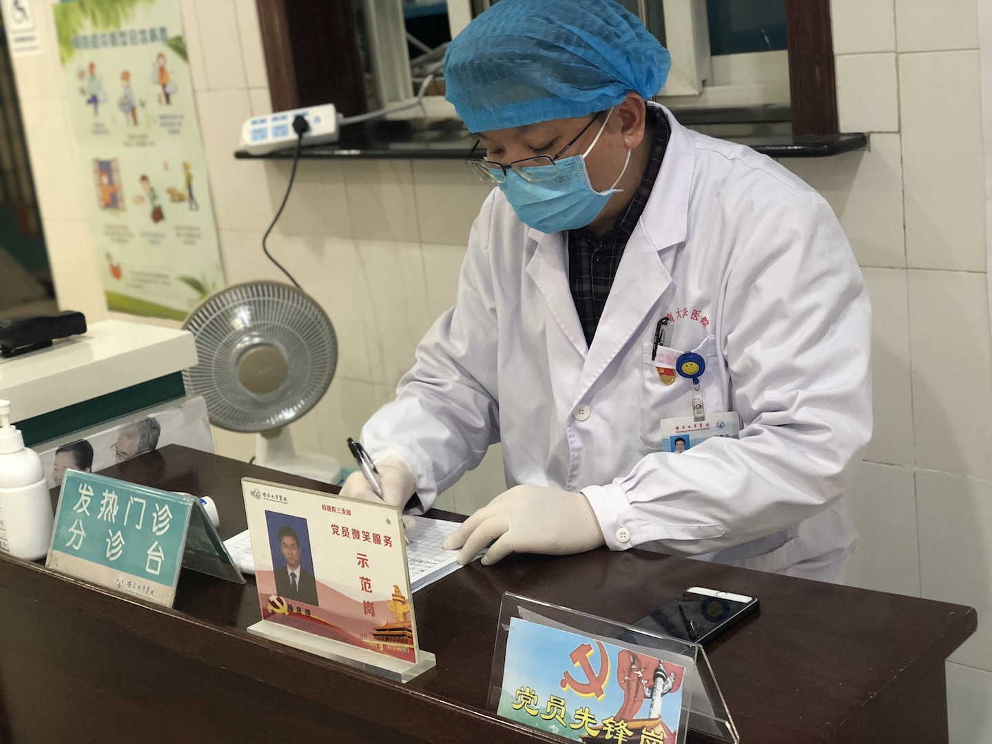 1月31日,在医院预检分诊处,第一批招募的6名党员志愿者分批次一对一的去执勤点接受培训。“疫情就是命令,防控就是责任,医院党员干部自觉站在疫情防控一线,按照党中央指示和学校群防群控要求,坚决打好疫情阻击战”,党总支书记李余廷在观摩培训时为同志们打气。新党员袁迹宇激动表示:“感谢组织的信任将我安排在了第一批次,我一定不负众望,坚守好夜间的岗位。”