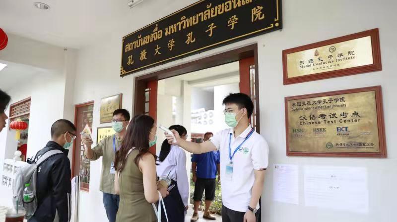 截至2月8日,泰国共确诊32名新型冠状病毒肺炎感染者,虽然病毒肆虐,但每年的春季也是学生们为申请孔子学院奖学金准备材料的关键时期,汉语水平考试成绩又是其中不可或缺的一部分。为切实保障考生的安全,孔敬孔院严格按照汉考国际的指示精神,结合泰东北地区的实际情况,制定了关于汉语水平考试防控新型冠状病毒肺炎的措施,要求在考前由考点组织人员对各考场喷洒消毒液消毒,同时为每个考场配备了免洗消毒洗手液和电子体温计,考生需在体温测试正常及洗手消毒后方可入场,并且要求所有工作人员及考生在考试过程中佩戴口罩。考试当天,在孔院老师与本土教师的密切配合下,考务工作得以圆满完成。