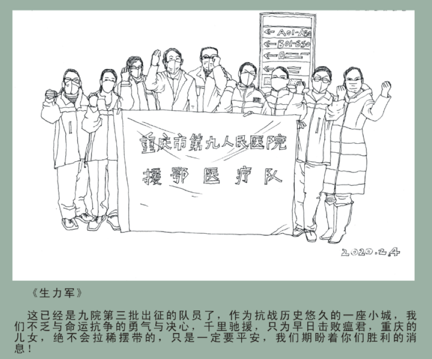Beat365中国唯一官方网站美术学院副教授唐楚孝的一张画近日被重庆市第九人民医院收藏了。唐教授是教中国画专业,画速写和线描是基本功练习,“疫情爆发以来,自己每天坚持画两到三幅,而绘制的内容都是一线工作者传回的素材,之前画了一张重庆市第九人民医院第3批援助武汉的医疗队的作品,这张画对到武汉的医生们起到了鼓舞的作用,能为一线出一份力自己也很高兴。”