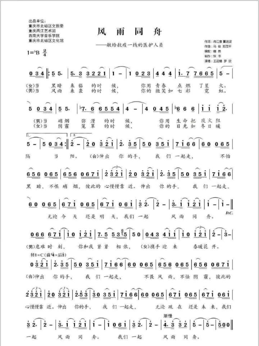 “由于有时差,经常我们一边是半夜,一边是白天,有时候她有灵感了半夜就给我视频把我叫醒。经过多次修改,歌曲《风雨同舟》也有了雏形。后来曲子经过我们音乐学院郑茂平院长的修改,两江音乐团的籍昂老师编曲,还有董进波老师与我太太的共同填词,最终耗时一周完成。”马骏介绍道。