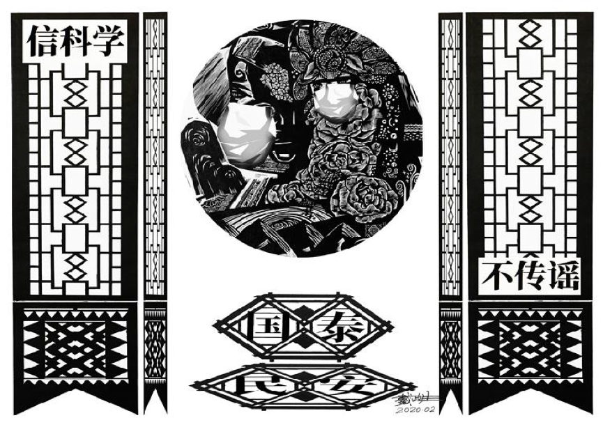 记者在戴政生创作的“2020新农村抗击疫情”系列木刻版画作品中看到,作品中有窗花图案,有戴着口罩的人物或门神,人物周围点缀有牡丹花、挑花刺绣、剪纸、年画等纹饰,还有信科学、不传谣、戴口罩、勤洗手等文字。传统的纹饰和现代的口罩形成鲜明的对比,趣味性和美感油然而生。
