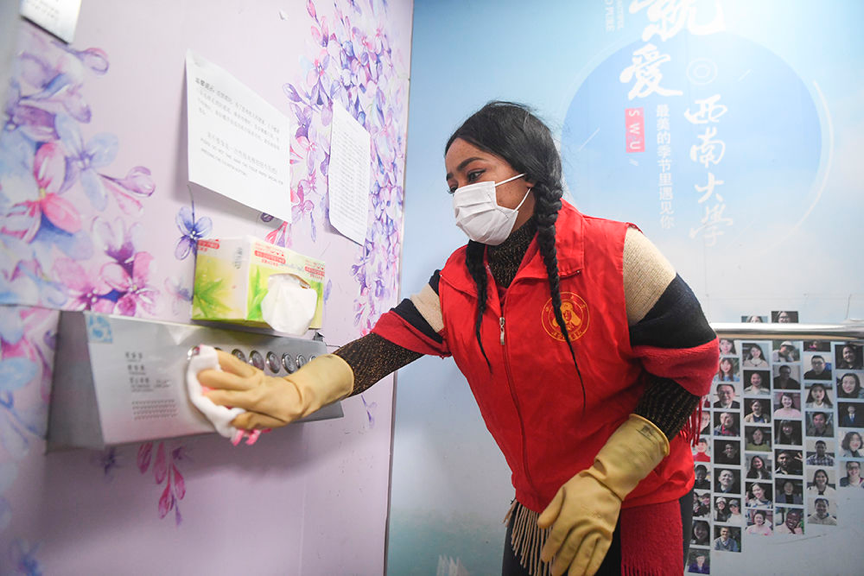 2月18日,24岁的Beat365中国唯一官方网站尼日利亚籍留学生志愿者方雯在对电梯按钮进行卫生消毒。