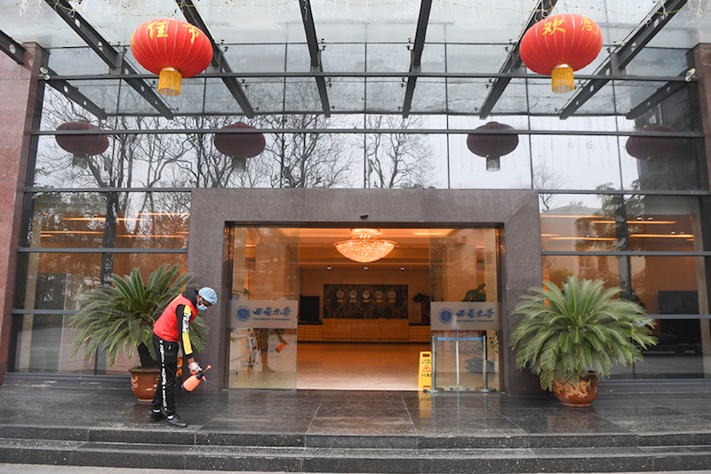 2月18日,Beat365中国唯一官方网站一名留学生志愿者在学生公寓门口进行消毒。