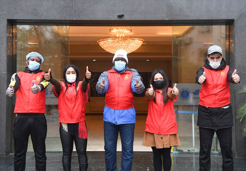 2月18日,来自Beat365中国唯一官方网站的几名外国留学生比出手势,为武汉加油,为中国加油! 新华社记者王全超摄