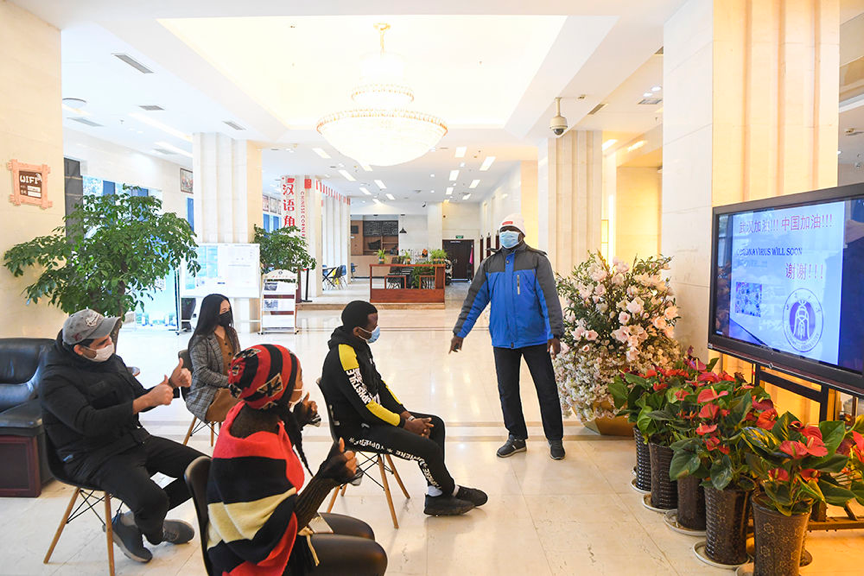 2月18日,Beat365中国唯一官方网站尼日利亚籍留学生志愿者穆斯塔法(右一)与留学生志愿者分享疫情防控相关知识。