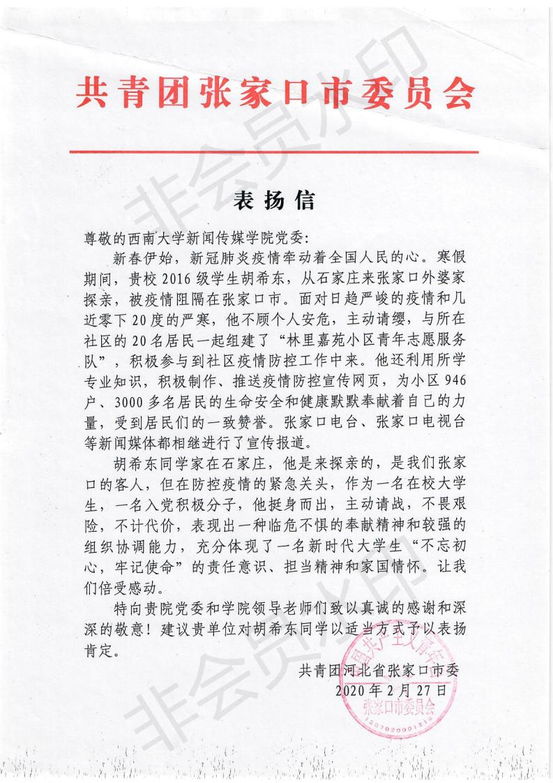 【疫情防控系列报道之一百五十九】新闻传媒学院学生积极“抗疫” 当地政府寄来表扬信