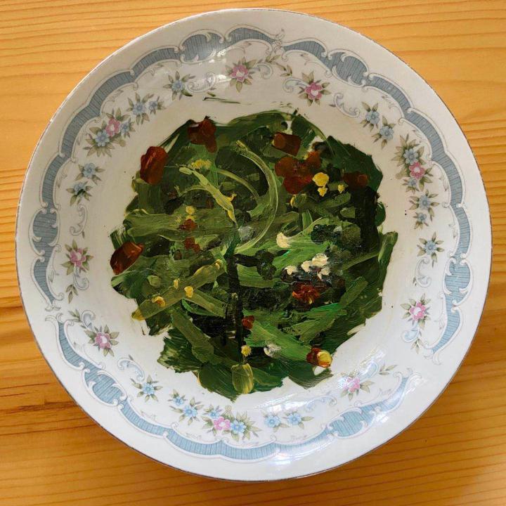 因为手上只剩下一些之前的丙烯颜料和软陶泥,因为疫情的原因,材料也不便购买,陈瑞杰想到:“既然是菜,那肯定就要装进盘子里啊。”就地取材,赶紧让妈妈张罗来了家里的盘子,用剩下的颜料画出了糖醋鱼、梅菜扣肉、炒时蔬等菜肴,还利用软陶泥制作象征团圆的南瓜饼。陈瑞杰把这些“画”的菜和妈妈做的“真”菜肴放在一起,一时间还难辨真假。