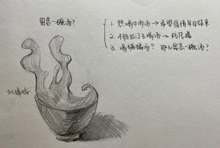 陈瑞杰介绍,在洛阳,大家早上一般会喝汤,但由于疫情影响,她一直没能喝到自己心心念念的牛肉汤,正好近期学校美术学院组织了一个抗疫西大青年艺术工作者群,于是,她打算做一碗蝙蝠形状的牛肉汤作为抗疫作品。