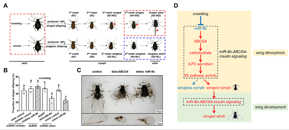 翅型分化是蚜虫对不良栖息环境的适应,蚜虫通过提高飞行能力使其逃离不良环境并找到新的栖息地,多种蚜虫在种群密度过大时存在跨代翅型分化现象。miRNA作为重要的后转录调控因子,能否介导高种群密度诱导产生的蚜虫翅型分化及其调控网络尚不清楚。项目组以褐色桔蚜(Aphis citricidus)和豌豆蚜(Acyrthosiphon pisum)为研究对象,探讨miRNA在蚜虫翅型分化和翅发育过程中的重要作用。研究鉴定到在翅型分化和翅发育过程中唯一下调的miRNA(miR-9b),其靶向调控ABC(ATP-binding cassette)转运蛋白(ABCG4);低种群密度下,抑制miR-9b的表达显著增加后代有翅率;而在高种群密度下,过表达miR-9b则会降低后代有翅率。此外,在翅发育过程中过表达miR-9b则会导致翅发育畸形;最后,研究发现miR-9b通过调节胰岛素信号通路活性进而影响蚜虫的翅型分化。研究结果拓展了miRNA作为环境因子的信号“传递介质”调控昆虫表型可塑性的分子机理。