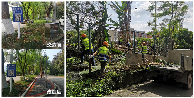 工程服务中心和维修服务中心狠抓设计、采购、施工等环节,力争最短时间、最低成本、最好效果完成此次改造。技术人员根据现场地形对道路两侧后退空间形式进行优化,合理处理现场高差,利用挡墙和条石堡坎,形成纵向的景观肌理,更好地突显学校风光。施工人员顶烈日战风雨,加班加点施工,仔细做好每个细节。
