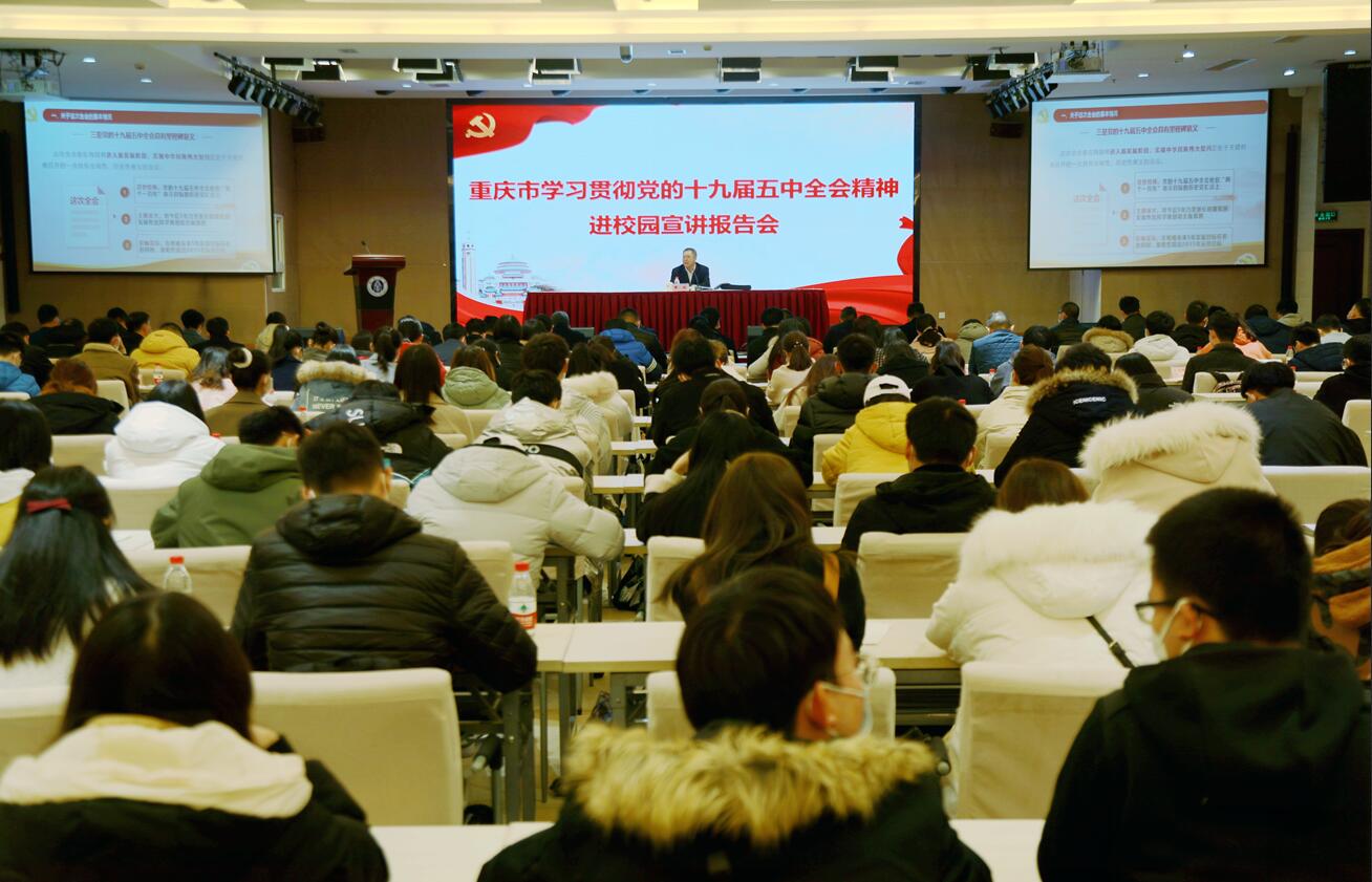 为学习宣传贯彻党的十九届五中全会精神,推动全会精神入脑入心,12月7日,重庆市党的十九届五中全会精神进校园宣讲报告会在学校国际学院报告厅举行。全体在校校领导、党委常委出席会议,机关职能部门主要负责人、师生代表参加会议。报告会由学校党委书记李旭锋主持。