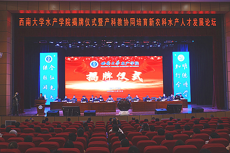 12月18日上午,水产学院揭牌仪式暨产科教协同培育新农科水产人才发展论坛在荣昌校区学生活动中心举行。副校长王进军,党委常委、党委组织部部长杨爱华,荣昌校区党工委、人力资源部、对外联络办公室等部门负责人和来自中国水产科学院长江水产研究所、广东海大集团股份有限公司等单位的领导、专家学者、企业负责人,以及水产学院师生共500余人出席会议。近40所兄弟高校的水产院(系)和行业协作单位以贺信、贺电或视频形式对水产学院的成立表示祝贺。揭牌仪式由水产学院党委主要负责人主持。