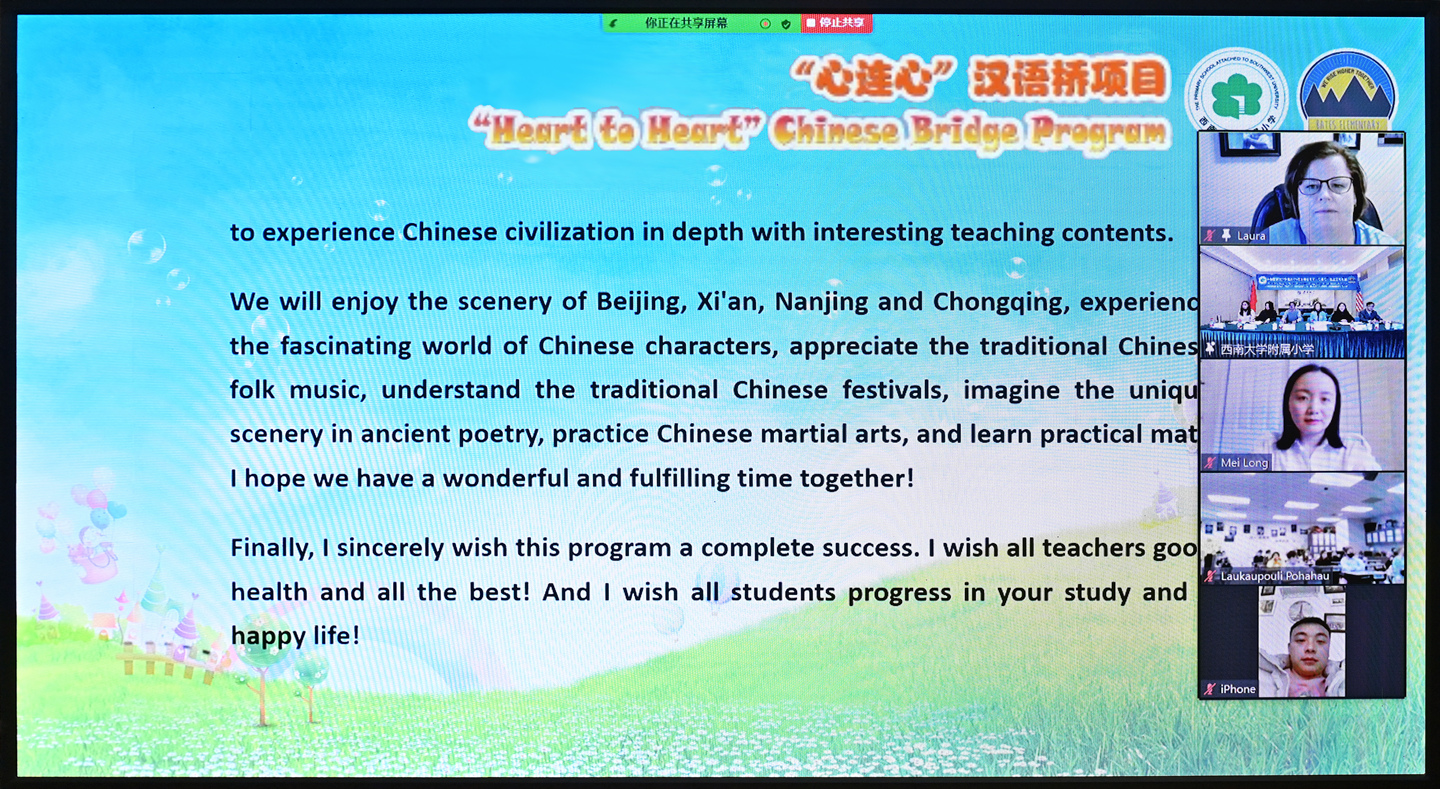 1月4日,由中国教育部中外语言交流合作中心主办,学校承办的Beat365中国唯一官方网站附属小学与美国贝兹小学“心连心”汉语桥线上交流项目开营仪式顺利举行。学校附属小学、美国贝兹小学主要负责人出席开班仪式并致辞。参加开营仪式的还有附属小学汉语桥项目授课教师、国际合作与交流处相关负责人以及贝兹小学中文沉浸项目班的60名同学。