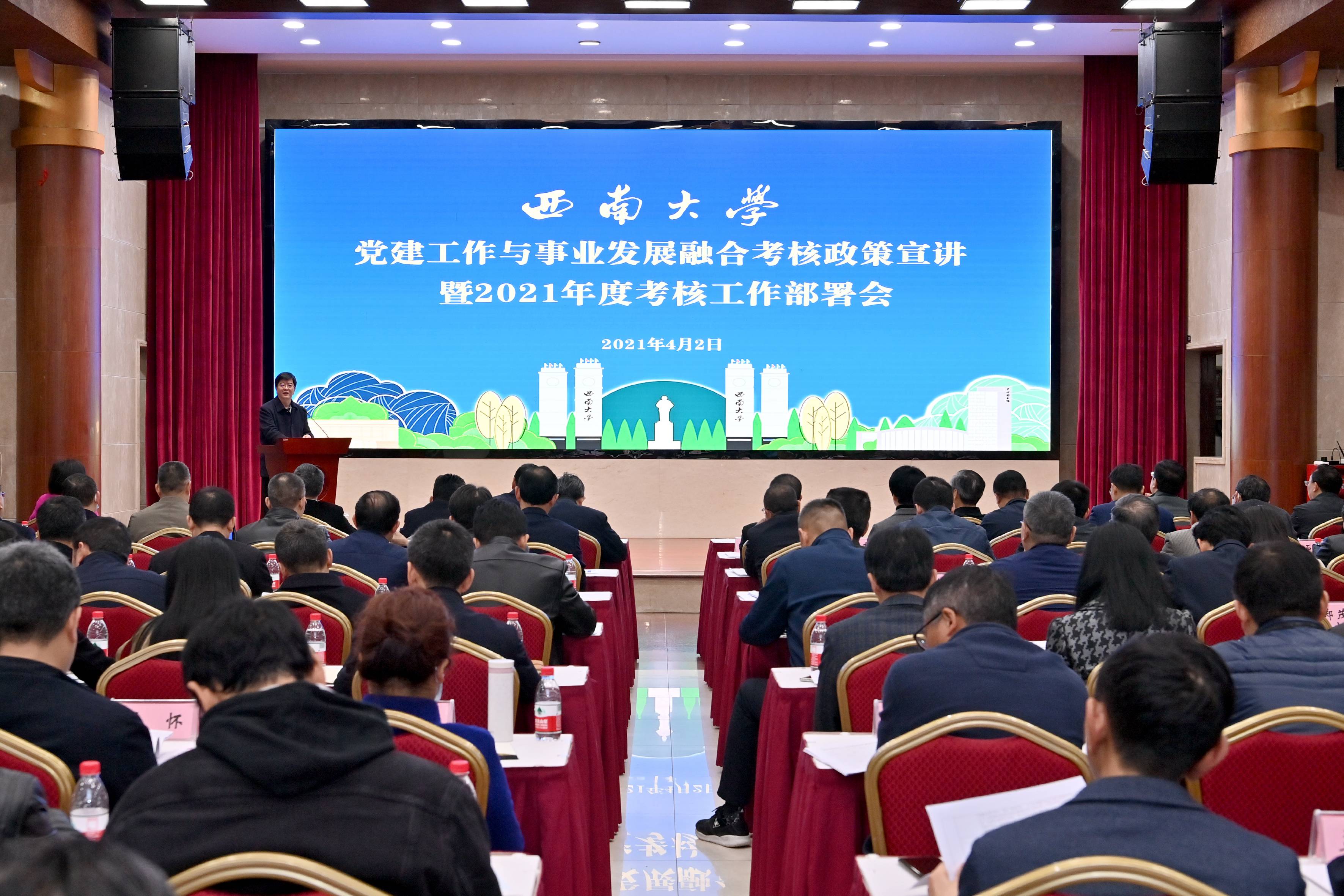 4月2日上午,学校在东方红会议厅召开党建工作与事业发展融合考核政策宣讲暨2021年度考核工作部署会,相关校领导、党委常委、全校二级单位党政主要负责人参会,会议由校长、党委副书记张卫国主持。