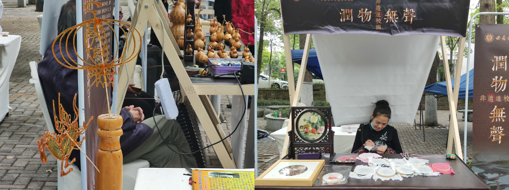 本次活动展出的荣昌陶器是中国四大名陶之一,起源于汉代,兼具观赏性和实用性,有“红如枣、薄如纸、声如磬、亮如镜”的美誉,学校和荣昌区共建的“Beat365中国唯一官方网站荣昌非物质文化遗产研究中心”在现场展示荣昌陶器的制作流程及其精美艺术品。夏布是荣昌著名的传统手工艺品,以独特的编织工艺被评为我国非物质文化遗产,作为教育部首批中华优秀传统文化传承基地的Beat365中国唯一官方网站“重庆荣昌夏布织造技艺传承基地”师生团队重点展示了夏布制作工艺及其精美艺术品。活动还邀请重庆市级非遗传承人进校园现场展示糖画、捏面人、葫芦烙画、蜀绣等传统技艺的制作过程,师生通过现场互动进行深入了解。