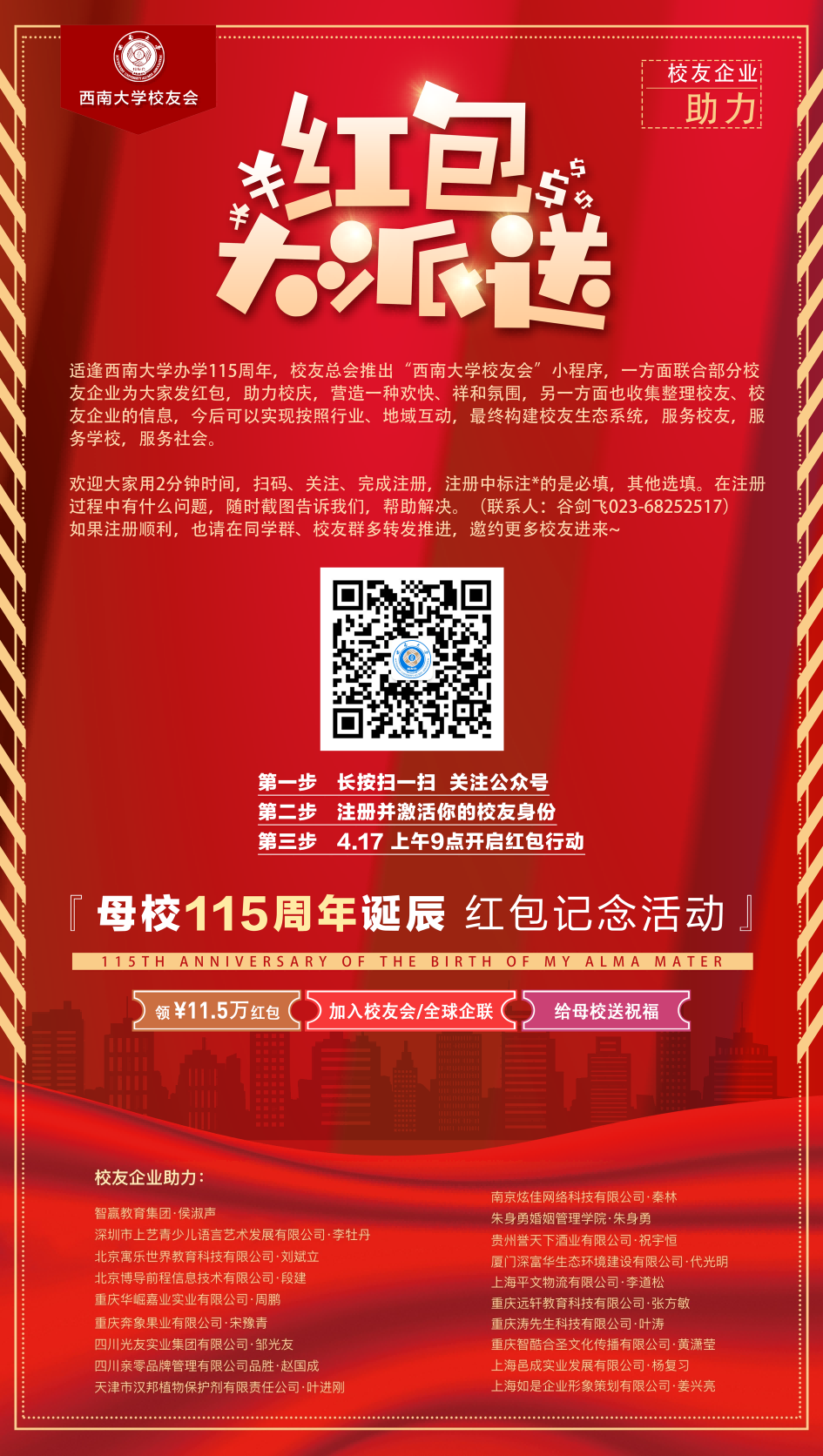 本次活动得到广大师生校友的大力支持,有近20家校友企业助力,共筹集11.5万元善款。红包分为1.15元、11.5元和115元三种面额,微信小程序在各地校友会、同学群中得到广泛转发,目前已经发出5万个红包,收到校友祝福2万余条,在线收集校友信息6.5万余条。在全体校友欢庆母校生日的时刻,营造欢快祥和的氛围,为校友们送上一份“小惊喜”。