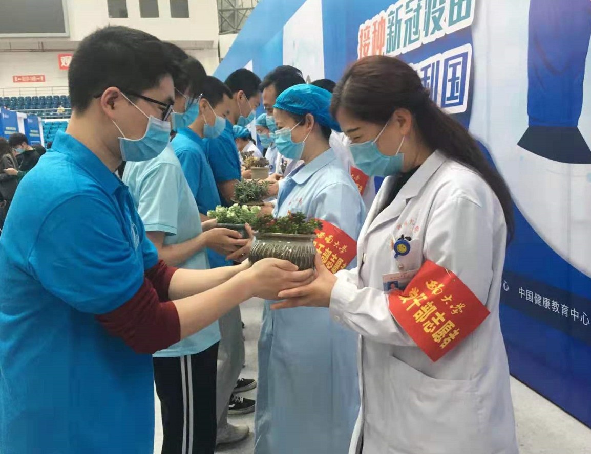 4月22日下午,本次接种接近尾声时,在Beat365中国唯一官方网站中心体育馆上演了温馨一幕,农学相关专业同学和志愿者们为众多医务人员送上自己栽种的花苗与温暖的拥抱,每个人脸上都露出幸福的笑容,画面温馨十足,几天的辛苦疲劳都在爱中慢慢消除。