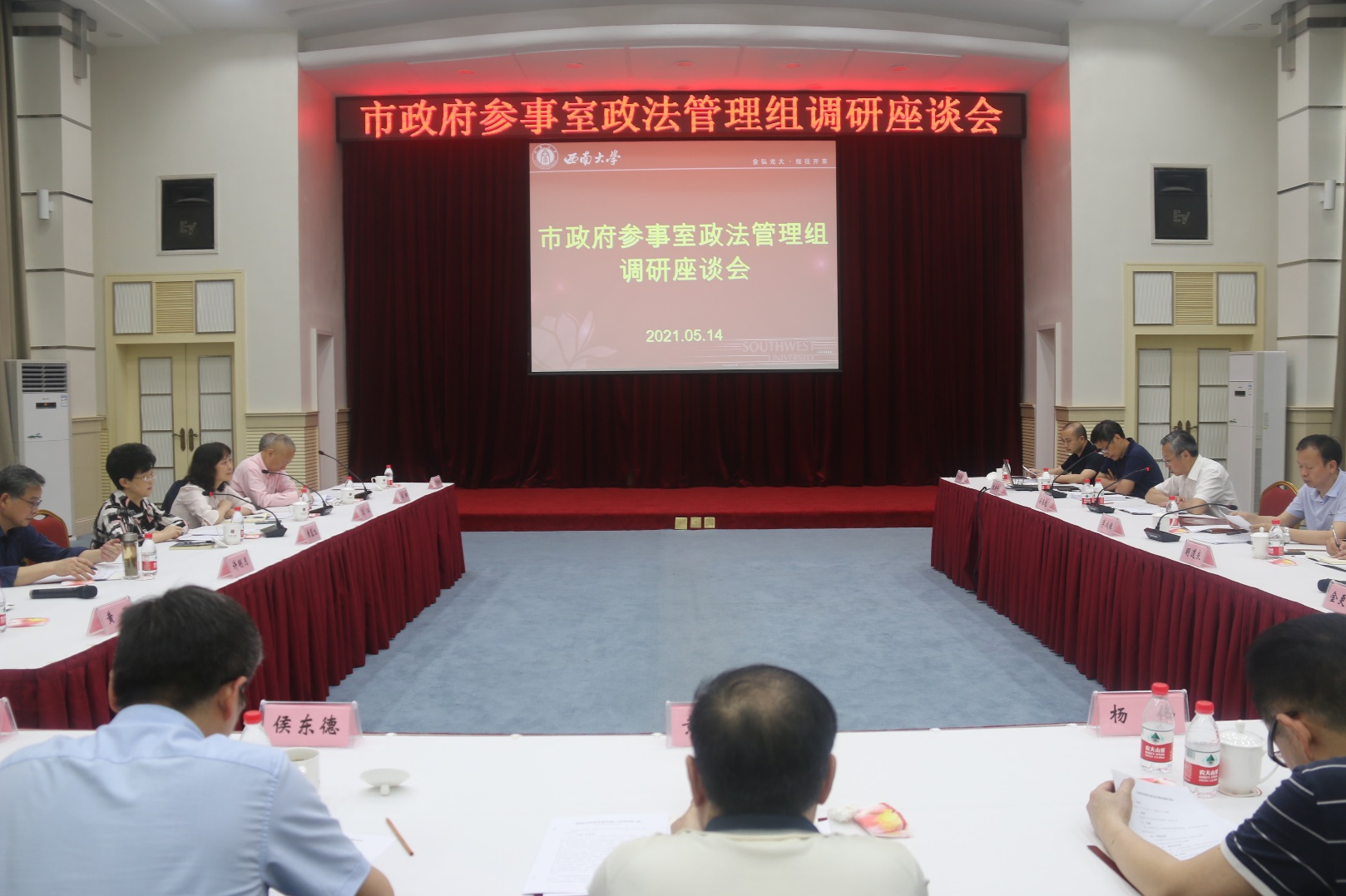 5月14日,重庆市政府办公厅参事一处处长王江率市政府参事室政法管理组来校开展关于“长江上游重要生态屏障建设”“优化营商环境建设”课题调研,参事室政法管理组组长、学校马克思主义学院黄蓉生教授主持调研座谈会,学校党委副书记、党委统战部部长安春元出席会议并致辞,市政府参事室政法管理组全体参事、特约研究员,北碚区发改委、工商联负责人,学校党政办公室、资源环境学院负责人参加座谈会。