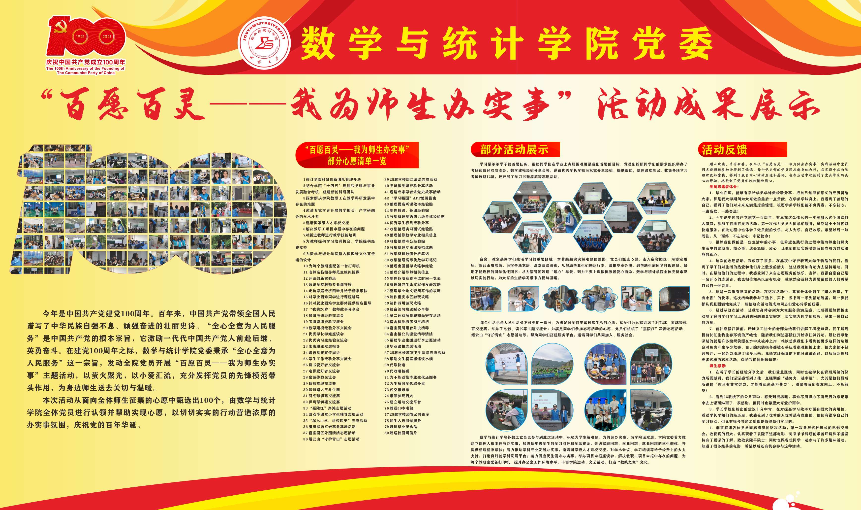 在建党100周年之际,数学与统计学院秉承“全心全意为人民服务”宗旨,发动全院党员开展“百愿百灵——我为师生办实事”主题系列活动,以萤火聚光,以小爱汇流,以百件实事为身边师生送去关切与温暖。