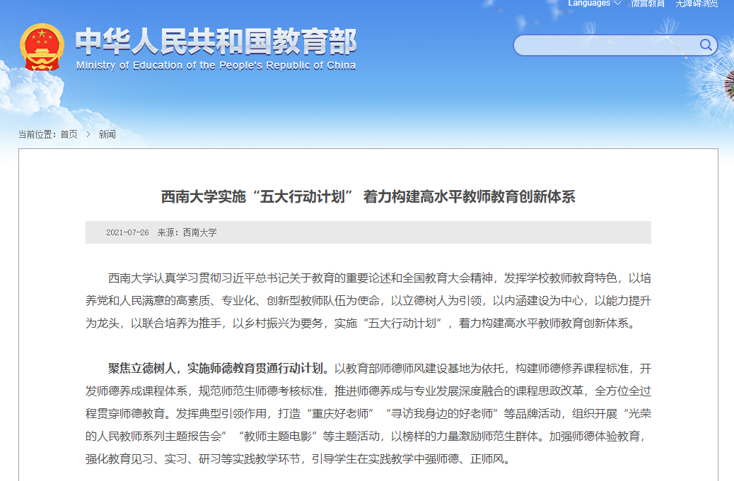 近日,学校高水平教师教育创新体系建设工作受到教育部网站报道,相关内容由党政办公室、教师教育学院报送。教育部网站报道原文如下: