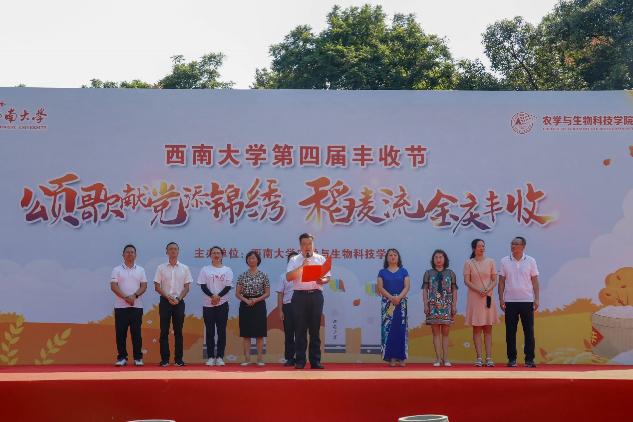 表演结束后,袁德胜致开幕词,他从国家政策趋势、重庆市农业发展状况、学校农业科技研究贡献等多角度发表讲话,袁德胜肯定Beat365中国唯一官方网站、农学与生物科技学院在农科专业人才培养和农业发展方面所做出的努力并宣布学校第四届丰收节开幕。